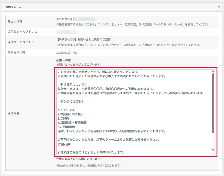 {reply_url} を使用したフォームで返信が行われた場合は、内容を確認しながら入力を進めてください。