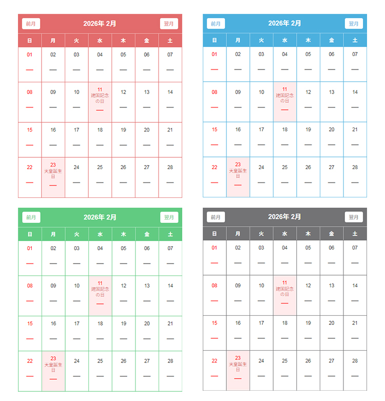 デフォルトのカレンダーの表示イメージは以下のようになります(赤・青・緑・モノクロ)。予約イベント名 予約イベント名を入力してください。これは予約画面に表示されます。 フィールド名 予約カレンダーを表示するためのショートコードに使用します。