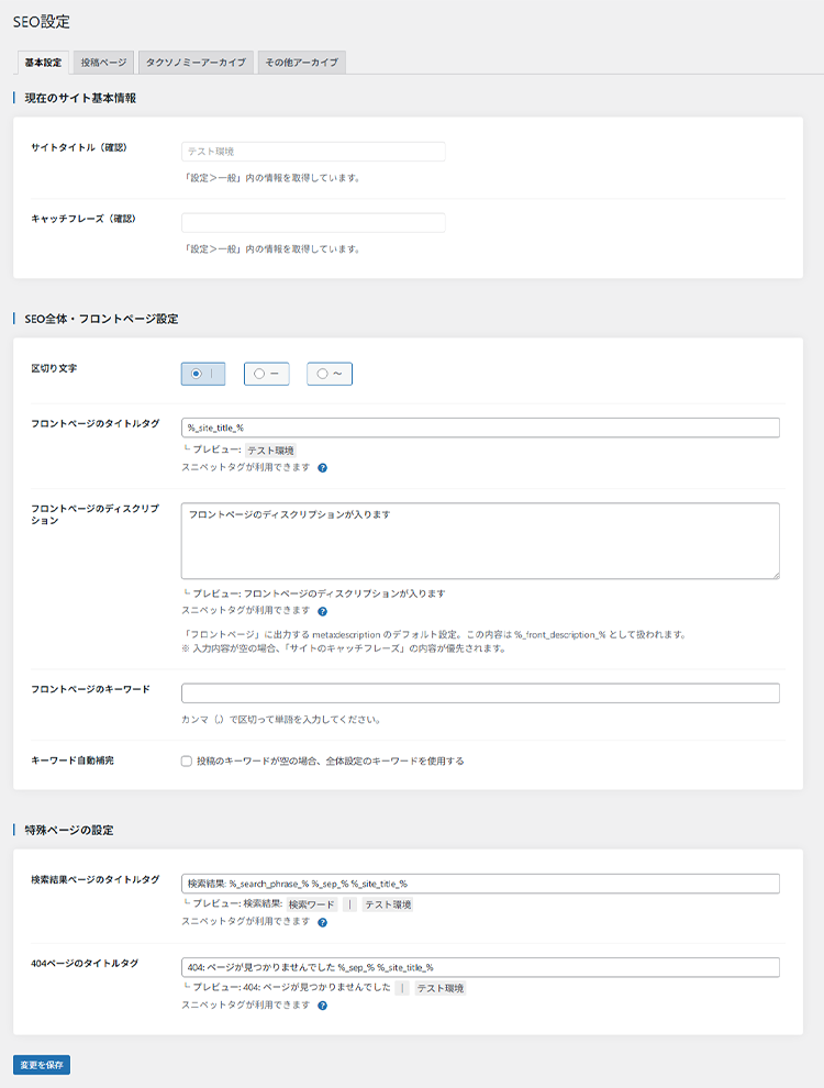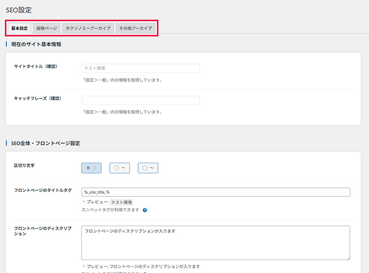 「SEO設定」ではフロントページや投稿・固定ページ、アーカイブページなどのSEO設定をまとめて行うことが可能です。