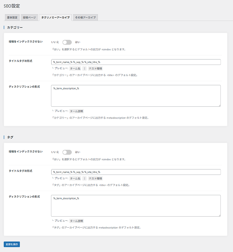 ここではタクソノミー(カテゴリーやタグ)のアーカイブページの設定を行うことができます。