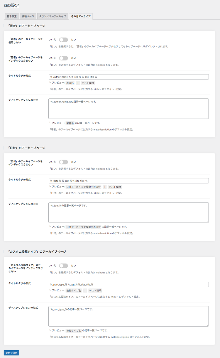 ここでは著者や日付、カスタム投稿タイプのアーカイブページなどの設定を行うことができます。