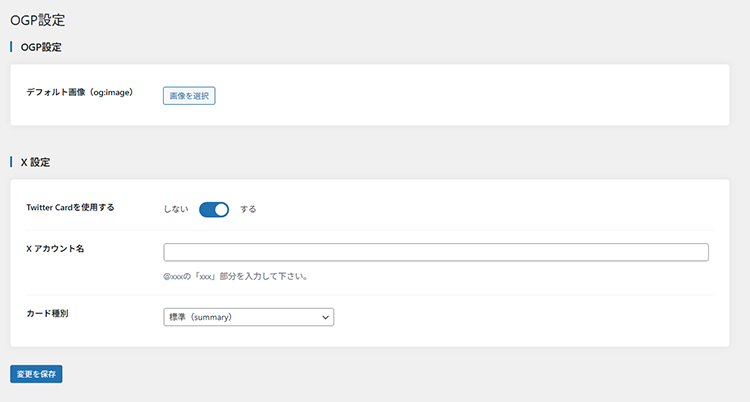 あくまでこの画像はデフォルトのもので、投稿や固定ページでは登録されたサムネイル画像がog:imageとして使用されます。Twitter Cardを使用する 上記のog:imageを使用するかしないかを選択できます。 X アカウント名 このwebサイトに関連するXのアカウントがある場合は、アカウント名を入力してください。 カード種別 シェアした際のカードのサイズを指定することができます。